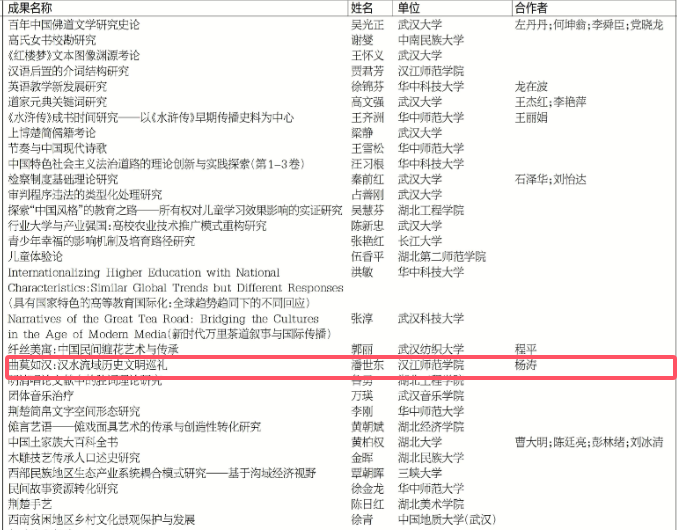 日前,从湖北省社会科学优秀成果奖评审委员会办公室获悉,我校潘世东教授所著《曲莫如汉:汉水流域历史文明巡礼》一书,在第十四届湖北省社会科学优秀成果奖评选中荣获二等奖。该著作系“十四五”国家重点图书出版规划项目及国家出版基金资助项目《汉水流域文明研究文丛》的重要组成部分。基于文化历史学、文化哲学与文...