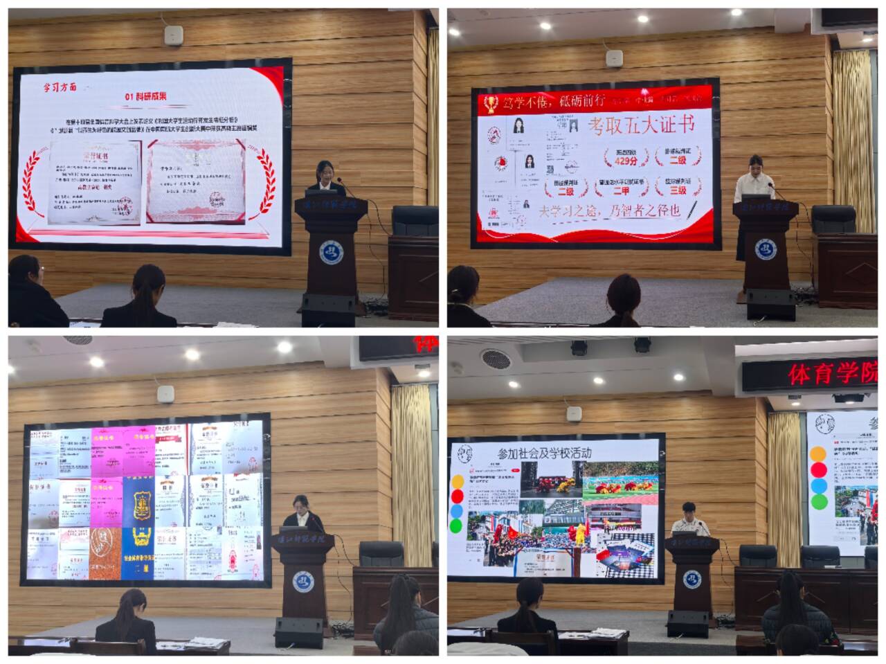 答辩会上,10名学生依次登台汇报。体教2402班高银泽以“以逐梦之程,绘就青春华章”为题,阐述了自己从专业学习、社会实践、志愿服务再到科研创新的成长故事,他用自己的亲身经历告诉在场同学们:努力和坚持是对大学时光的最好诠释。体教2402班的李双、谢瑜晴和社体2401班的黄文博则分享了他们在龙狮队中追梦的故事,正是千百次的托举和跳跃,让他们站上了国奖答辩的讲台。体教2301班的谭博涵、蔡雪、徐柳等同学同样用优异的专业成绩和扎实的科研成果在本次答辩会上交出了高质量答卷。在评委提问环节,各位评委围绕汇报内容展开深度追问,问题既聚焦专业细节——如何把理论知识和实践教学相结合,也关注实践落地——向支教的同学提问“如何把支教经历和师范教育相结合”。面对评委们专业的提问,同学们沉着思考、条理作答,既清晰回应疑问,也主动分享待改进方向,展现出对专业知识的熟练掌握与开放谦逊的学习态度。评委们则在点评中充分肯定同学们的成长与突破,同时给出相应指导,这让整场答辩不仅是成果展示平台,更成为一场传递奋斗精神、涵养专业情怀、激发创新热情的育人大课堂。