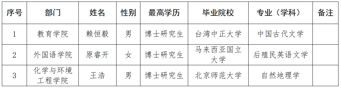 根据省人社厅有关政策和规定,依照《汉江师范学院高层次人才引进管理办法》要求,经资格审查、面试、考察、心理测试、体检等环节考核,学校研究拟聘用博士3人,名单如下。