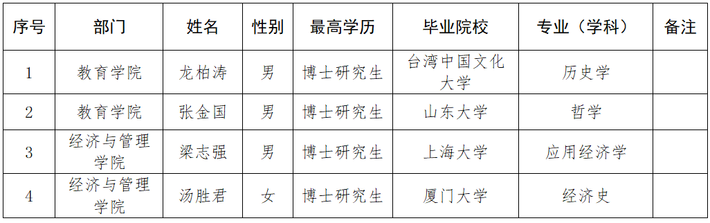 根据省人社厅有关政策和规定,依照《汉江师范学院高层次人才引进管理办法》要求,经资格审查、面试、考察、心理测试、体检等环节考核,学校研究拟聘用博士4人,名单如下。