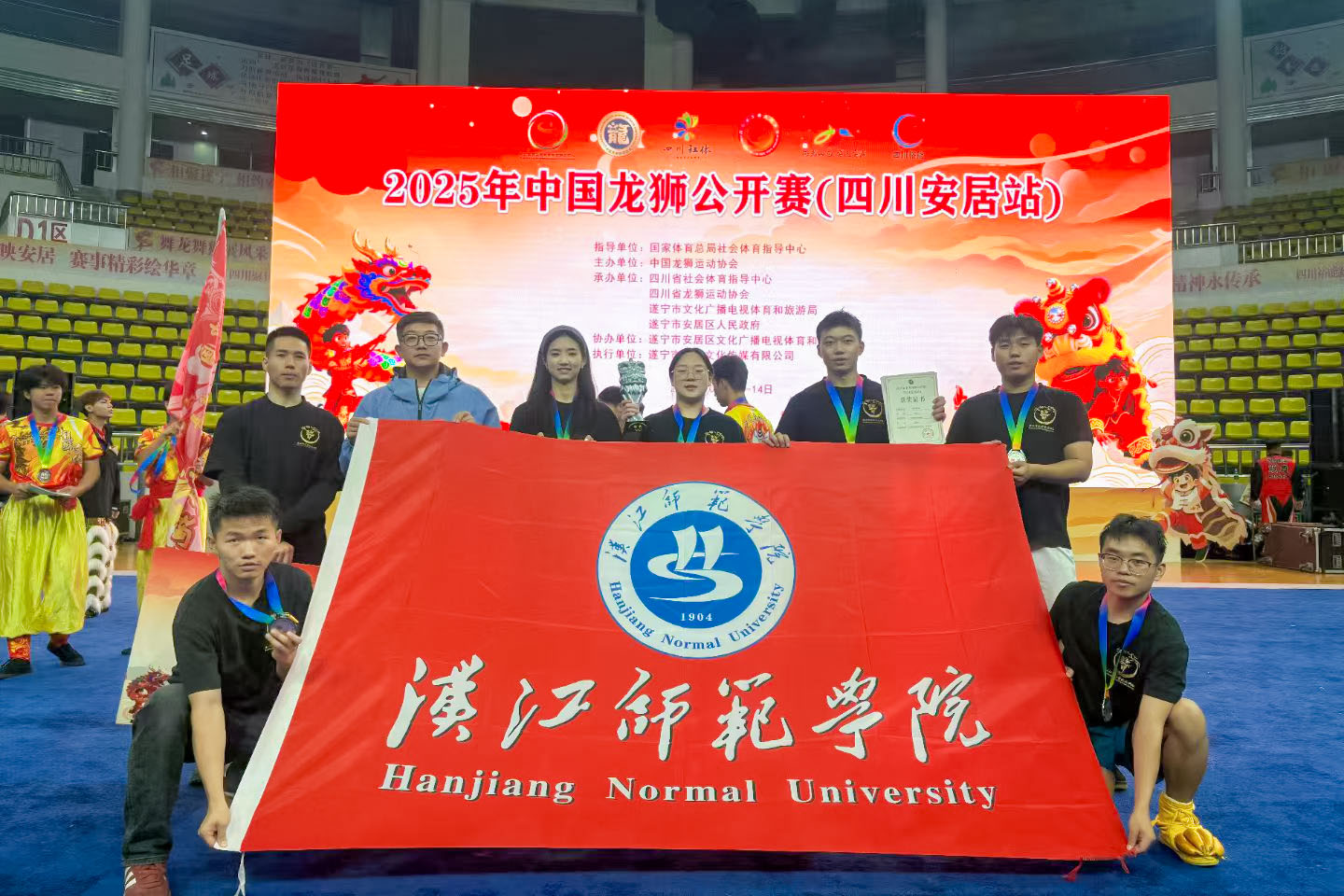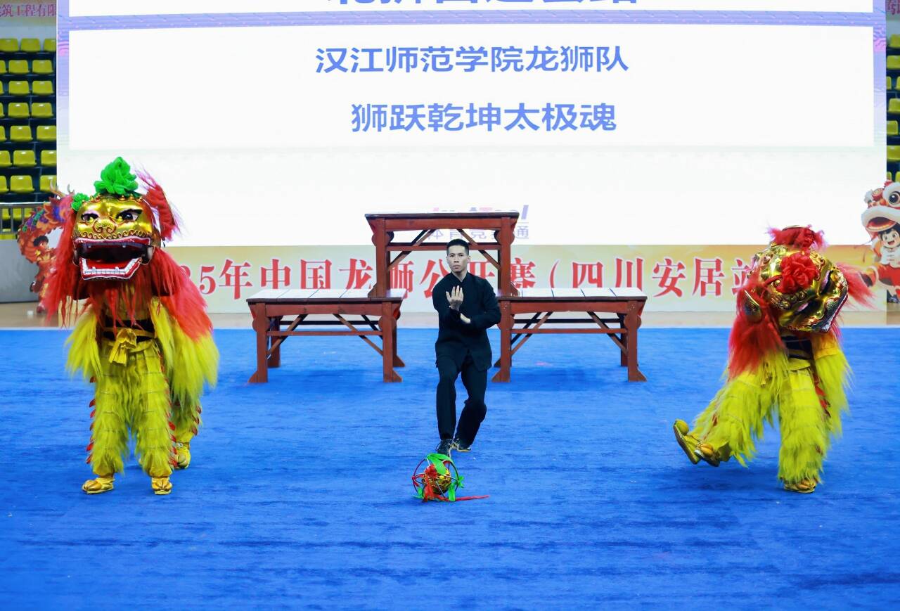 10月11日—14日,2025年中国龙狮公开赛在四川安居圆满落幕。本次比赛共设置舞龙、南狮、北狮、彩带龙四大核心竞赛类别,共吸引来自吉林、上海、福建、河南、湖北、广东、广西、重庆、四川、云南10个省(区/市)16支队伍近200名运动员参赛。汉江师范学院舞龙舞狮队凭借扎实的功底与出色的发挥,在激烈角逐中脱颖而出,成功斩获“北狮自选”项目银奖。