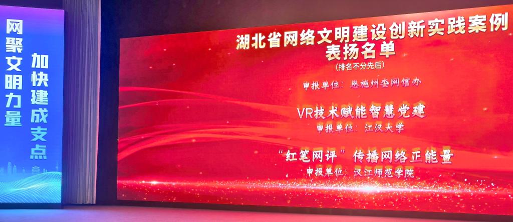 10月11日,2025年湖北省网络文明宣传月启动仪式在武汉举行。启动仪式上,省委网信办发布了湖北省网络文明建设创新实践突出案例,对50个案例进行通报表扬。汉江师范学院培育、申报的网络空间文明创建案例《“红笔网评”传播网络正能量》榜上有名。