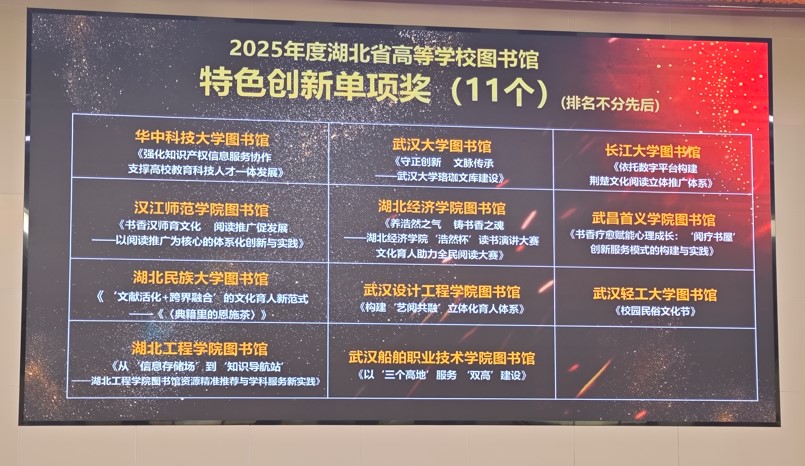 12月10日至13日,由湖北省高等学校图书情报工作委员会主办、湖北工程学院图书馆承办的2025年湖北省高校图书馆馆长工作年会在孝感召开。我校图书馆申报的《书香汉师育文化,阅读推广促发展——以阅读推广为核心的体系化创新与实践》项目,从全省百余所参评高校中脱颖而出,荣获2025年度湖北省高校图书馆“特色创新单项奖”。同时,李小平、李慧两名党员获评湖北省高校图书馆2025年度“先进工作者”。