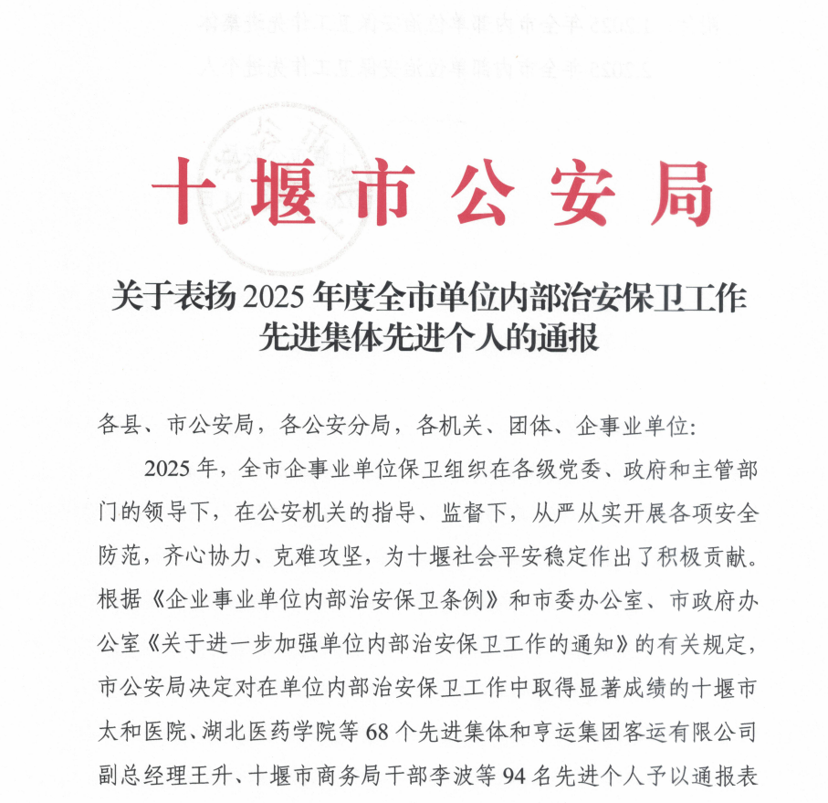近日,十堰市公安局印发通报,我校被授予“2025年度全市内部单位治安保卫工作先进集体”荣誉称号,这是对学校保卫处全面构建校园安全防控体系工作成效的高度认可。