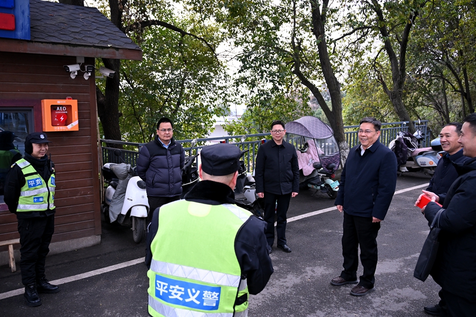 付永昌一行先后来到集贤楼总值班室、学校办公室、视频监控中心、上海路大门等校内值班岗点。每到一处,付永昌都与值班人员亲切握手、互致问候,并送上节日慰问品。他详细询问了各岗位的值班安排和运行情况,现场检查了安保设备与后勤保障设施的运行状态,叮嘱大家要时刻绷紧安全弦,以“一马当先”的责任感站好岗、守好责,全力确保校园在春节期间的安全、稳定与祥和。