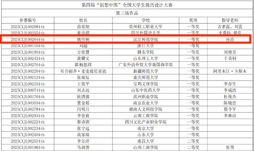 近日,第四届“创想中国”全国大学生简历设计大赛圆满落幕。我校历史文化与旅游学院历史学专业2301班姚伶俐同学在孙浩老师指导下,凭借专业扎实、创意鲜明的简历作品,从全国众多高校参赛者中脱颖而出,荣获全国一等奖,充分展现了我校学生良好的职业素养与创新能力。