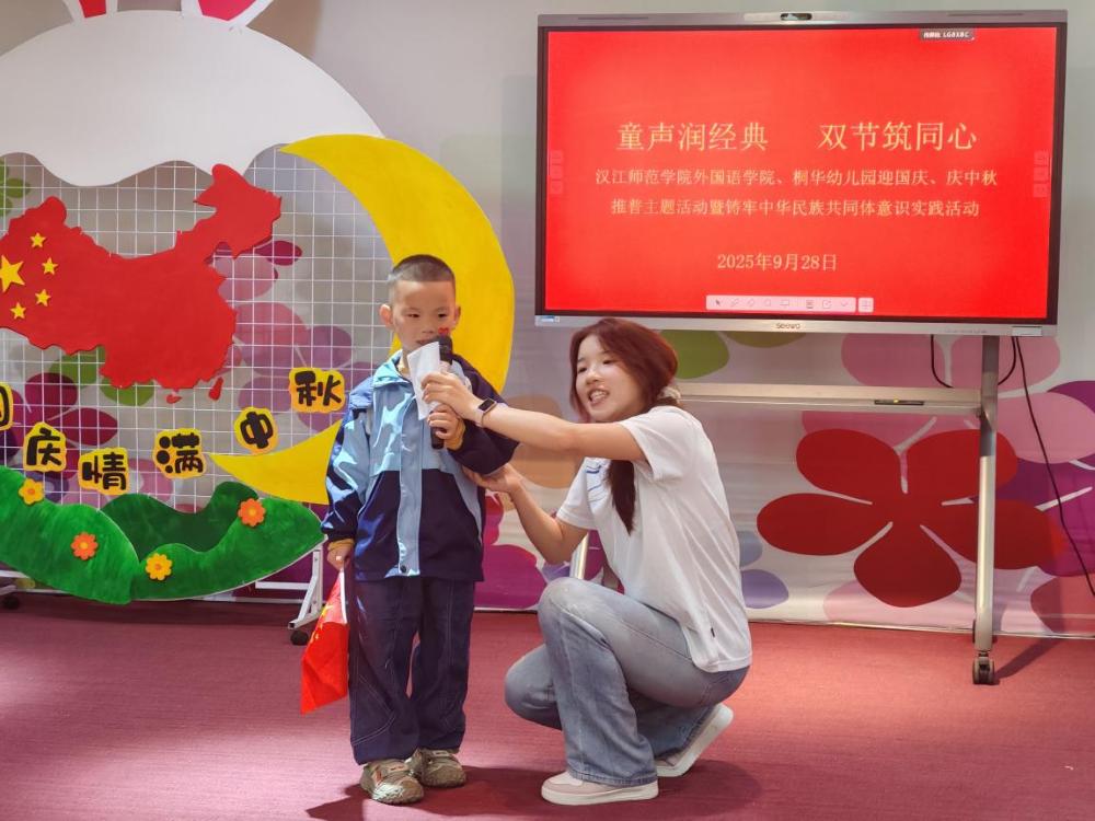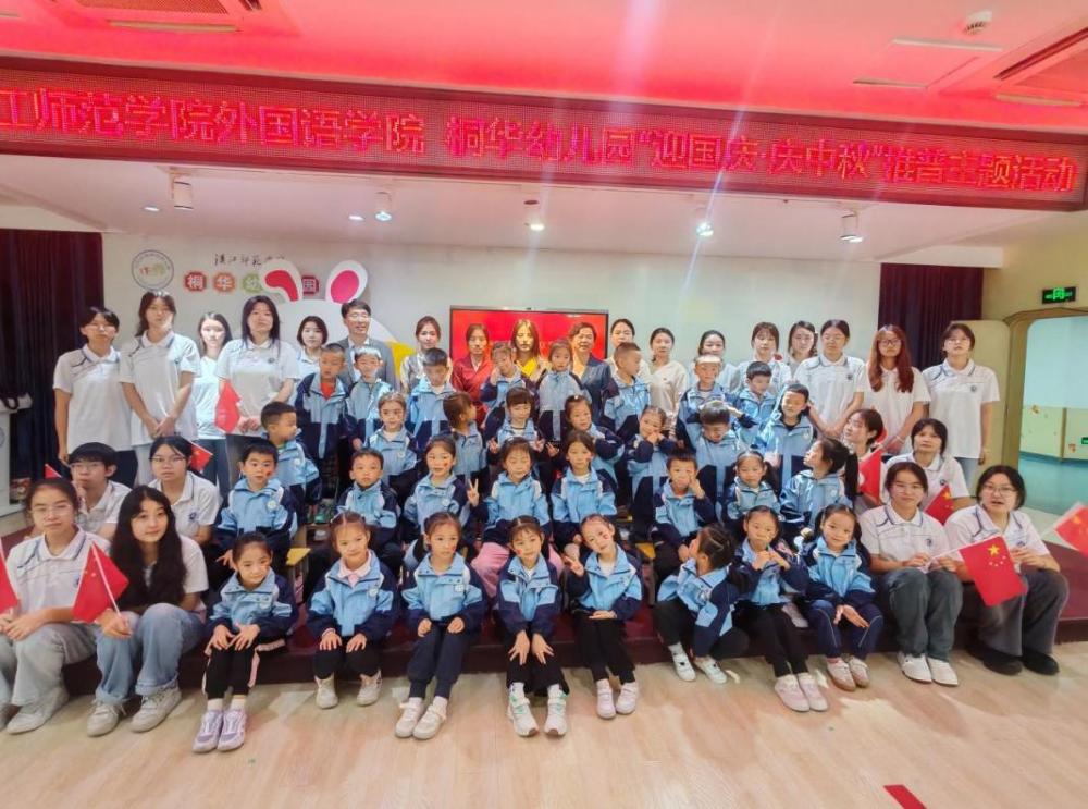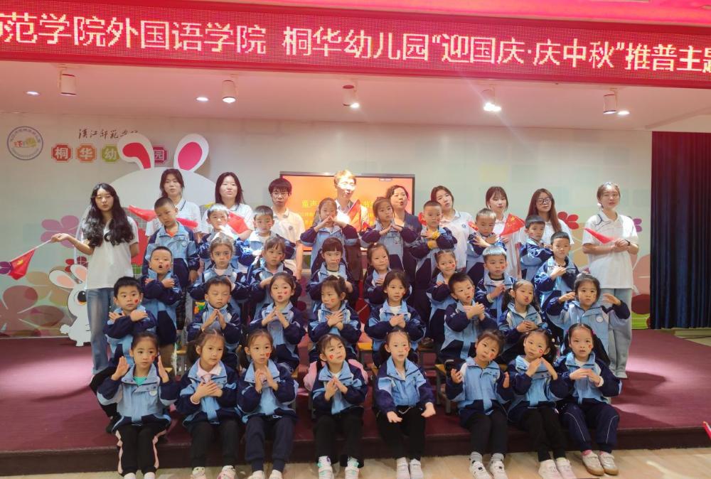 金秋送爽,丹桂飘香。在国庆与中秋双节来临之际,为加大国家通用语言文字推广力度,促进铸牢中华民族共同体意识教育,9月28日,外国语学院分团委、学生党支部联合桐华幼儿园,共同举办“童声传经典,双节筑同心”主题实践活动。校党委常委、宣传部部长梁仕新,外国语学院分党委书记王官华,桐华幼儿园园长汤清芬及双方师生代表200余人欢聚一堂,共庆佳节。