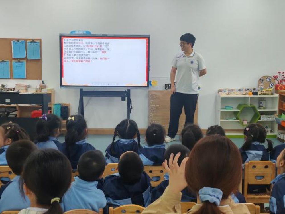 童声嘹亮,经典传唱。“童声推普组”的志愿者们耐心逐句教唱《歌唱祖国》。小朋友们手持国旗,全神贯注跟唱,稚嫩的歌声充满朝气。在“我是小歌手”环节,孩子们踊跃登台,用标准普通话自信演唱,赢得阵阵掌声。全体师生共同演绎《歌唱祖国》手势舞,嘹亮歌声、欢笑声与舞动的小红旗交织成动人画面。