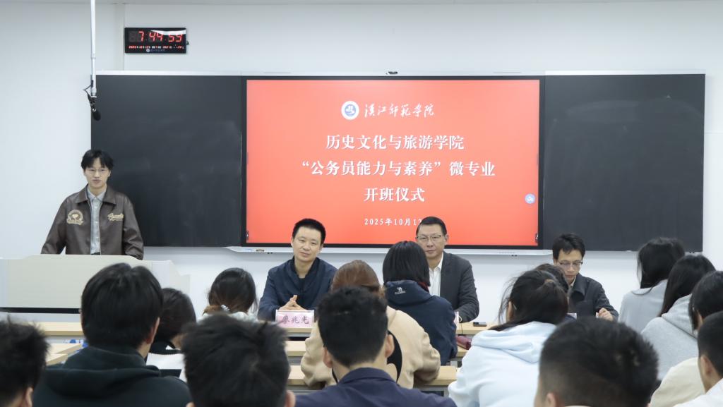 为深化应用型人才培养改革,精准对接基层治理现代化人才需求,10月12日上午,历史文化与旅游学院“公务员能力与素养”微专业开班仪式在求真楼A408举行。历史文化与旅游学院院长饶军、教务处副处长张亚明、学院副院长廖兆光出席仪式,微专业授课教师代表王道国、史玉琴、龚蕙子、柳宇及全体首批学员参会,仪式由微专业负责人李文君主持。作为全校首批聚焦公共治理领域人才培养的微专业,此次开班标志着学校在应用型人才培养细分领域的探索迈出实质性步伐,为拓宽学生职业发展路径、服务国家基层治理战略提供了新载体。