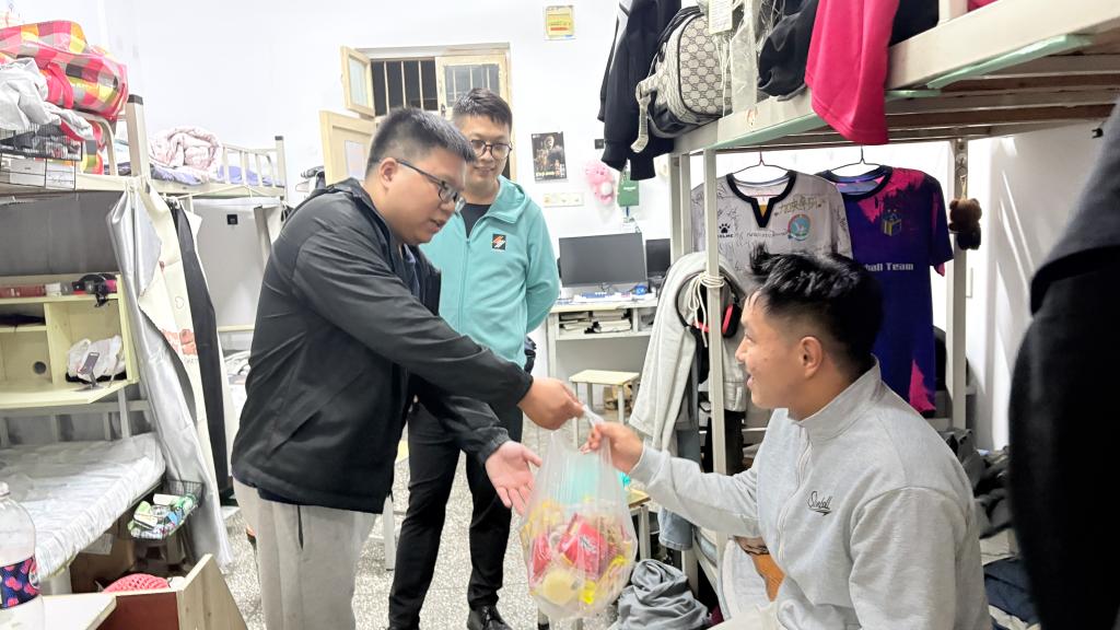 走访过程中,罗晓忆与陈吉冲先后走进多间学生寝室,将满载关怀的月饼、特色零食递到学生手中,递上的是一份心意,更是学院对学生的挂念。罗晓忆与同学们亲切交谈,细致询问大家近期的生活状况、在校住宿体验以及因假期未归而产生的思乡情绪。针对25级新同学,罗晓忆重点了解了入学以来的学业适应情况,并结合自身经验给予切实建议,鼓励新同学们“尽快转变角色,打好专业基础”,呼吁其积极调整心态,融入大学节奏。