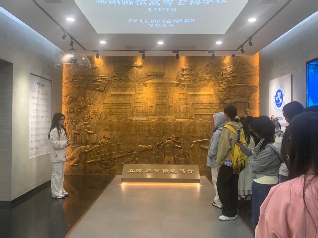活动期间,三位讲解员有序引导新生穿梭于序厅及各核心展区。在序厅,新生们通过前言与《学校迁建记》初步感知学校“从筚路蓝缕到薪火相传”的初心。沙金浮雕里“肩挑背扛搬运物资”的场景与“立德、启智、修能、笃行”的校训交相辉映,让大家对学校精神有了直观认知。步入“校史篇”展区时,1906年郧阳府师范学堂毕业证照格外引人注目——作为馆内“镇馆之宝”,它以湖北省档案馆特藏原件为母本制作,还被列入“湖北百馆珍品档案”。讲解员向新生介绍其罕见的尺寸与承载的历史价值,让大家从百年前学子的课程成绩与品行记录中,真切体会到学校“育人为本”的师范初心。