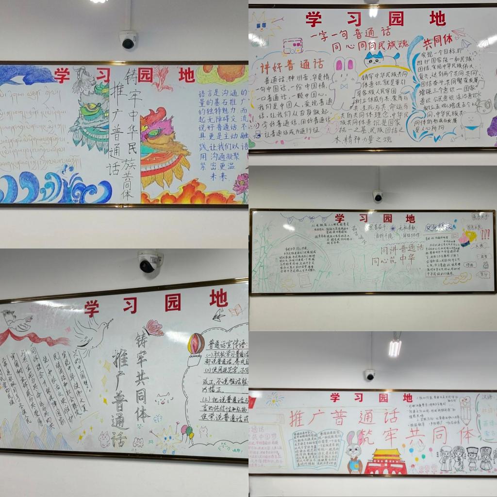 主题黑板报创作则成为传递普通话文化内涵、弘扬语言文明的重要载体。各班紧扣“推广普通话与铸牢中华民族共同体意识”的关联,从多元维度展现主题深意:有的班级以熊猫、国旗等富有民族辨识度的元素为视觉开篇,既生动阐述了普通话作为国家通用语言的核心价值,又创新呈现汉语、藏语等多民族语言书写的“普语筑梦”主题内容,以多民族语言的同频共振,直观凸显语言互通在构建共同体意识中的纽带价值;有的班级则将民族艺术符号融入设计,以色彩斑斓的民族纹饰、寓意吉祥的传统瑞兽图案为点缀,搭配清晰的普通话推广实践方向解读,深刻传递“语言是跨文化沟通的桥梁,更是凝聚民族力量的精神基石”的核心理念。