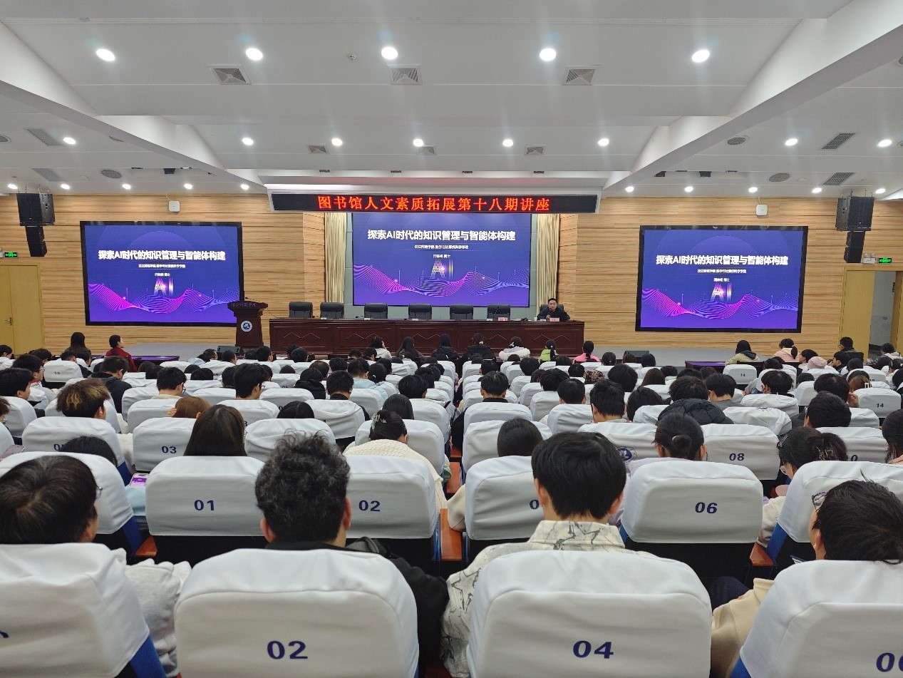 10月24日晚,图书馆人文素质拓展第十八期讲座在崇文楼C101举行,讲座主题为《探索AI时代的知识管理与智能体构建》,数学与计算机科学学院闫林杨博士主讲,图书馆副馆长孟胜银主持,近300名师生参加。