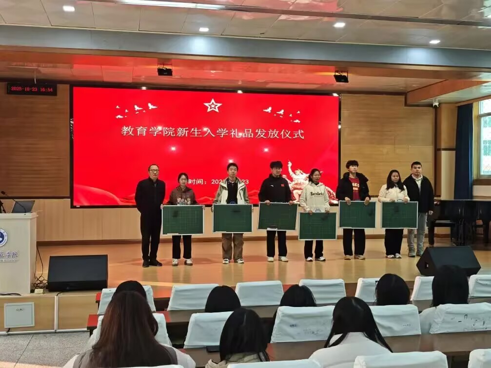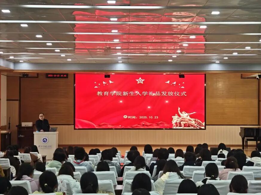 10月23日上午,教育学院2025级新生入学礼品赠送仪式在启智楼101教室举行。院长郭顺峰、党委副书记张洋与2025级全体新生共同见证这一“开学第一课”。