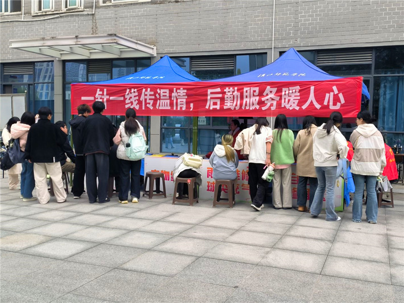 “一针一线传温情后勤服务暖人心”的红色横幅,时雨楼下广场的帐篷里热闹非凡;志愿者们穿针引线修补衣物,同学们拿着待补的外套排队等候,帐篷旁的配钥匙工具不停运转……这是学生公寓管理与服务中心响应“优质服务月”,重启“缝缝补补”爱心驿站的活动现场。