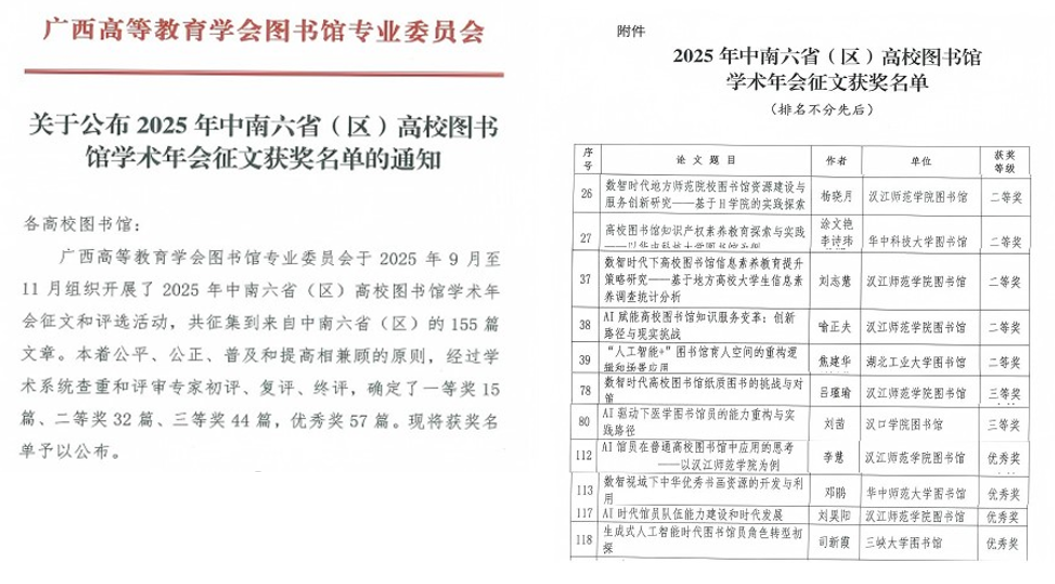 近日,广西高等教育学会图书馆专业委员会公布了2025年中南六省(区)高校图书馆学术年会征文和评选活动结果。我校图书馆共有6篇论文在本年度中南六省(区)高校图书馆学术年会征文评选活动中获奖,其中二等奖3篇、三等奖1篇、优秀奖2篇。