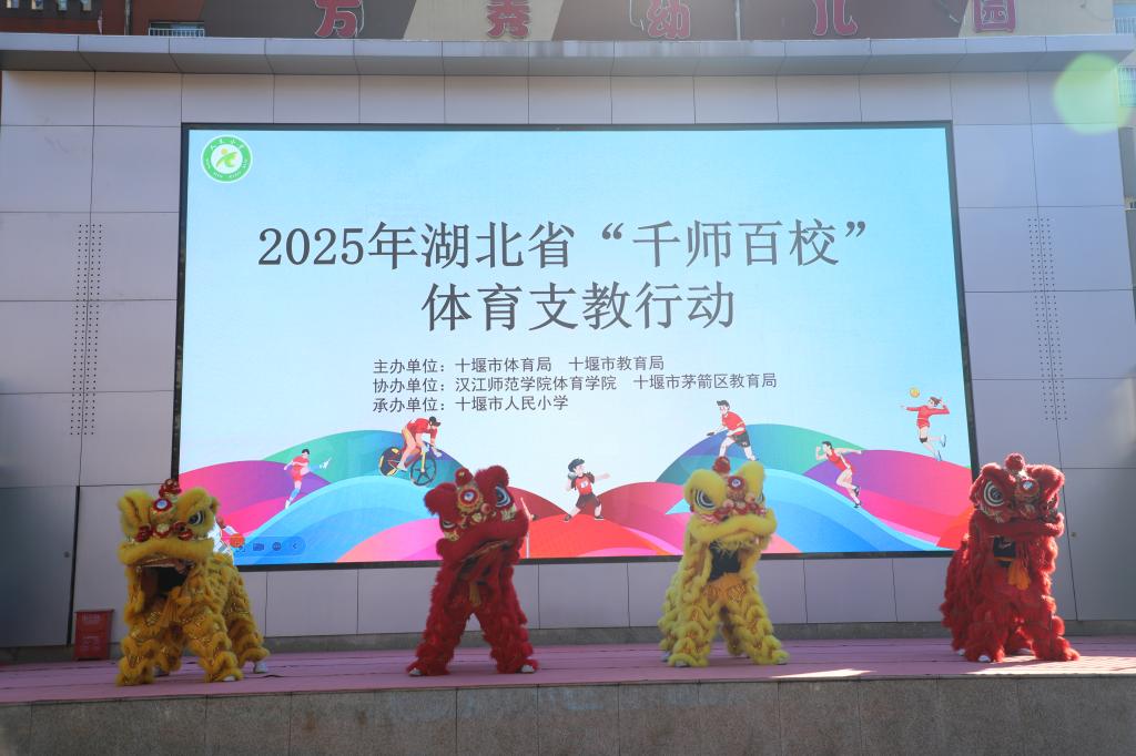 在支教成果展演环节,第一个登场的是汉江师范学院龙狮队。伴随着孩子们的欢呼声,两头红黄相间的龙狮迈着矫健的步伐跃入场地中央并和学生们近距离互动,队员们灵动的姿态将传统体育文化的魅力展现得淋漓尽致,他们精彩的表演瞬间点燃了全场气氛。随后,人民小学健美操队的同学们身着统一的服装登台。作为支教成果的直接体现,这群小队员们眼神坚定、精神饱满,每一个动作、每一次跳跃都充满了童真与活力,展现出体育支教带来的显著进步。最后登场的汉江师范学院健美操队,将展演推向了新的高潮。三个节目接连上演,传统与现代碰撞,童真与专业交融。这场体育支教成果展演,不仅让人民小学的师生们领略了龙狮文化的魅力与健美操的活力,更让体育精神与运动热情深深扎根在孩子们心中。