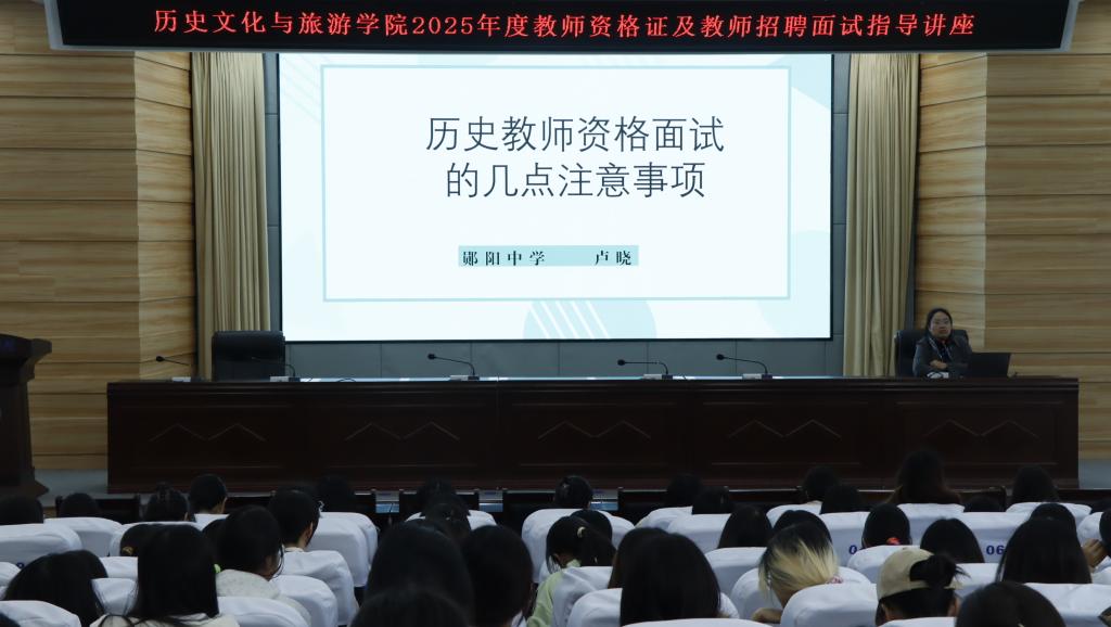 为助力学生提升教师资格考试及教师招聘面试能力,明晰备考方向,增强求职竞争力,11月23日下午,历史文化与旅游学院历史学专业于崇文楼C101报告厅成功举办了2025年度教师资格证及教师招聘面试指导讲座。本次讲座特邀十堰市郧阳中学资深教师卢晓担任主讲,不仅吸引了历史学专业学生踊跃参与,同时也得到了学院旅游管理、行政管理等专业同学的广泛关注和积极参加。讲座由历史学教研室主任孙浩老师主持。