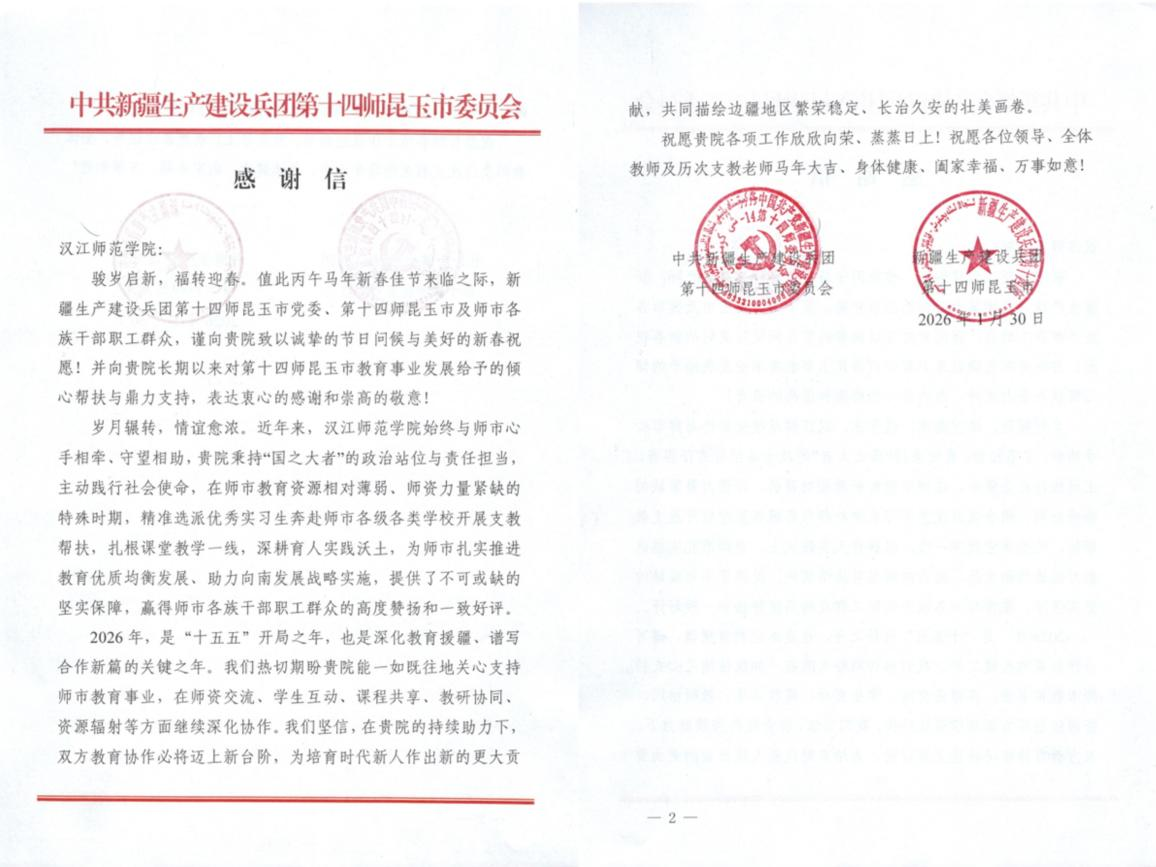 据悉,自2025年9月以来,我校已向新疆维吾尔自治区和田地区洛浦县和新疆生产建设兵团第十四师昆玉市选派69名优秀实习生,参与当地教育教学工作。他们以扎实的作风和倾情的奉献赢得了受援地的高度评价。此前,新疆生产建设兵团第十四师昆玉市专门向我校发来感谢信,对我校师生在边疆教育一线所作出的积极贡献给予充分肯定。这份来自兵团的感谢,不仅是对往期支教工作的褒奖,更成为激励本次73名出征学子接续奋斗、再创佳绩的最好“动员令”。