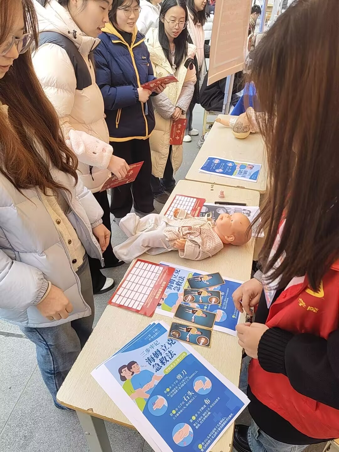 教育学院志愿服务展台围绕应急救护知识普及核心主题,精心开设海姆里克急救法科普与实操体验志愿服务项目。活动现场,志愿者们分工明确、耐心细致,通过理论讲解、案例分析、实操演练等多种形式,向在场参与者系统介绍海姆立克急救法的适用场景、操作要点与注意事项。针对不同年龄段人群的急救差异,志愿者们重点讲解并示范了一周岁以下婴儿与一周岁以上儿童及成人的不同施救手法,同时利用专业模拟人偶进行一对一指导,让每一位体验者都能亲手操作、切实掌握关键技能。