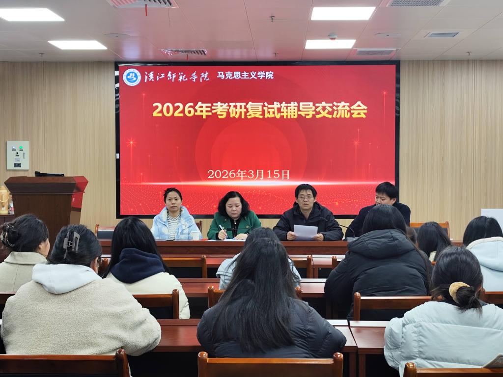为精准助力考研学子备战2026年研究生复试考试,3月12日,马克思主义学院在求真楼604教室成功举办了考研复试辅导专题交流会。本次交流会由院长助理、思想政治教育专业负责人符俊主持,辅导团队骨干教师李媛、孙景强、熊双颖参加。