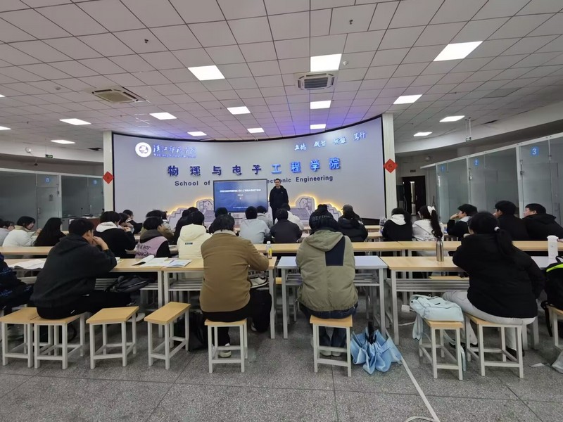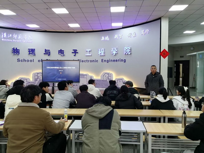 3月15日下午,物电学院2026年中国机器人及人工智能大赛线下培训会在崇文楼 C301大学生创新实验室顺利举行。副院长刘锋、指导教师张建猛出席,44名学生参加此次培训。