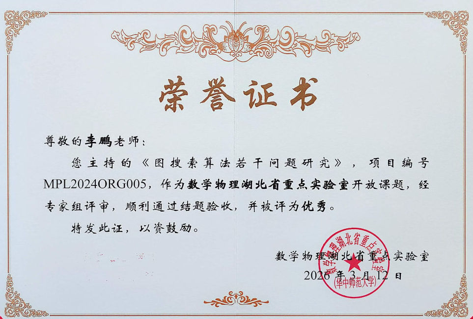 近日,数学与计算机科学学院李鹏副教授主持的数学物理湖北省重点实验室开放课题《图搜索算法若干问题研究》顺利结题,并获评“优秀”。该项目合作方为华中师范大学龙旸靖副教授。