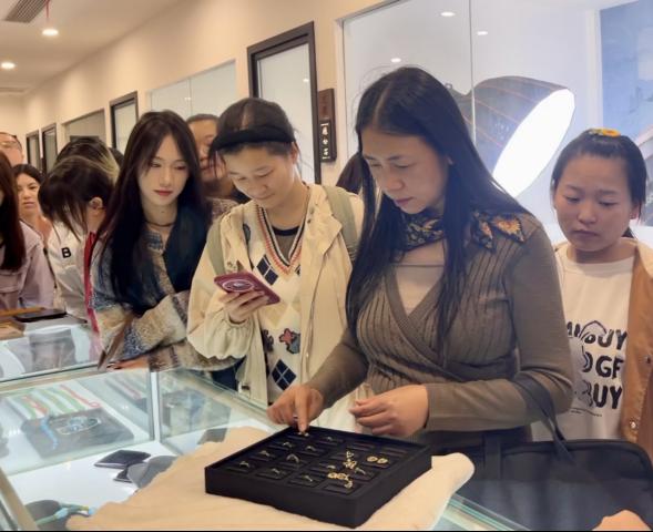 师生一行参观了园内金先生珠宝公司。该公司是以绿松石为主营业务的特色企业。同学们现场观摩该公司主播网上直播售卖绿松石产品。参观过程中,现代化的拍摄间、智能化的直播设备、琳琅满目的绿松石展示台无不彰显着直播基地的先进性。公司负责人傅成功总经理为学生们详细介绍了公司运营状况和直播特色商品,展示了公司发展成果。