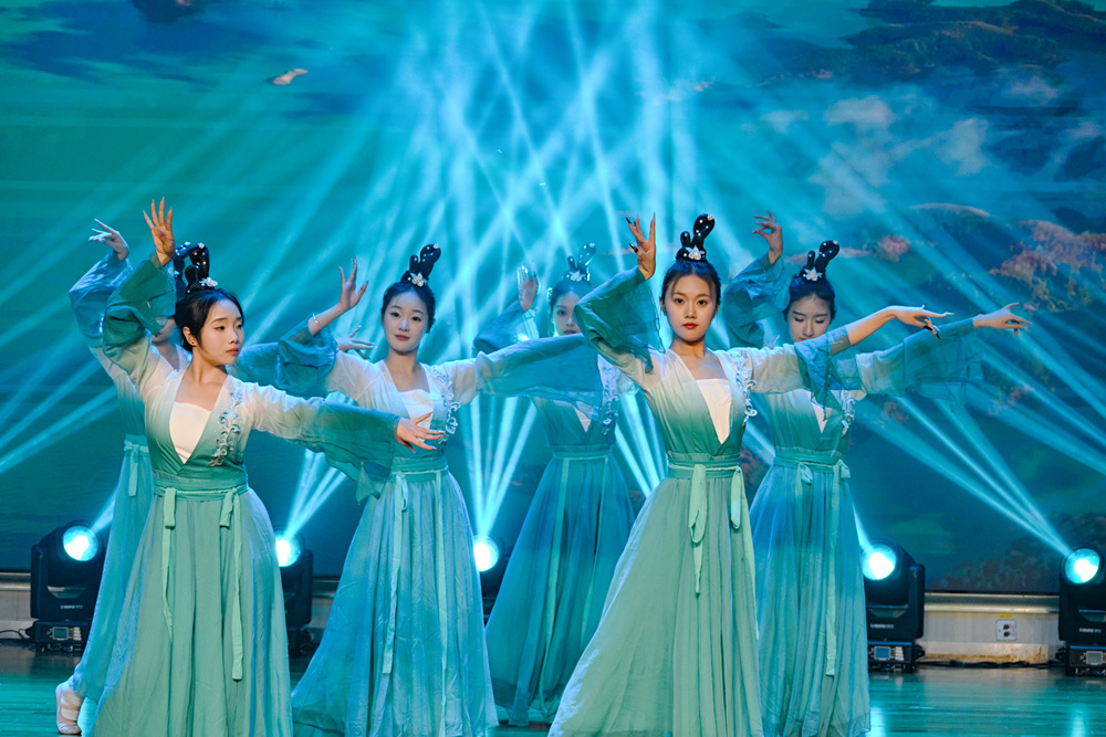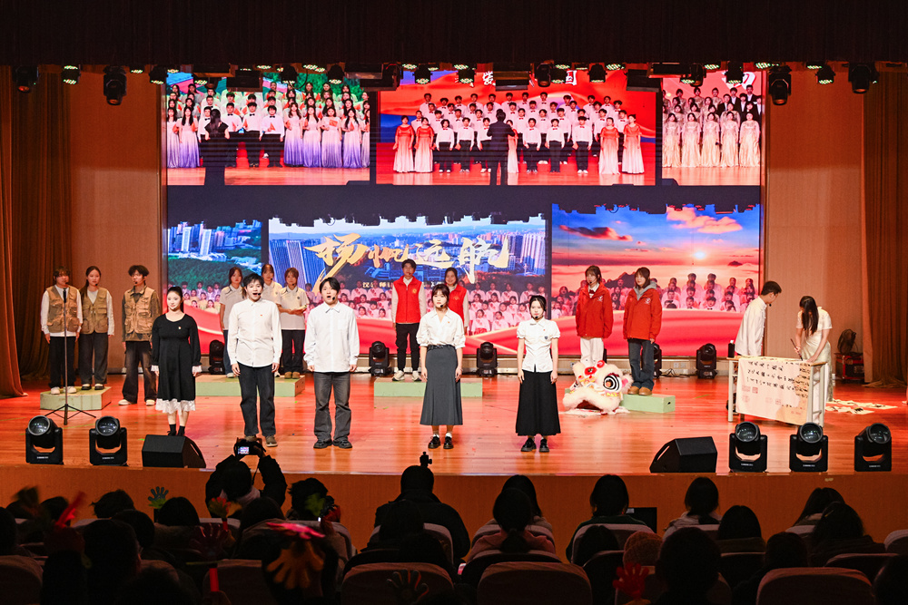 “大思政课”以“启卷-讲析-展望”为逻辑主线,创新“思政为核、美育为形、叙事为体”的叙事模式,设计了“初心·育人答卷”“奋斗·成长答卷”“征程·未来答卷”三大篇章。辅导员、班主任、学生代表、校友代表分别讲述奋斗故事,与年度表彰有机融合,将思政引领、价值塑造融入具象化的艺术叙事,生动呈现了学校“大思政”“大学工”体系协同育人的工作格局,激励广大师生在新时代共同书写新的“汉师故事”。系列情景节目中,《狮舞汉江启新篇》以“狮”“师”同音之巧,艺术化演绎师范精神的传承;《国旗之下》《我和我的祖国》营造出庄严深沉的爱国氛围;《一纸未生效的退学申请》《当》《信仰之光永不灭》《反诈班会》再现育人日常;《武韵民风》《民族团结一家亲》展现学子蓬勃朝气与民族团结风貌,《暗香》《青山远黛》展示学子扎根基层、服务社会的责任和担当;《赛马》《好运全都来》激发学子踏上新征程的信心和决心。
